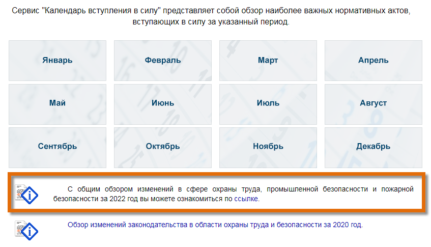 С этими и другими изменениями, которые ждут сферу охраны труда и безопасности в 2022 году, вы можете ознакомиться в сервисе «Обзор изменений. Календарь вступления в силу» в системе «Техэксперт: Охрана труда».