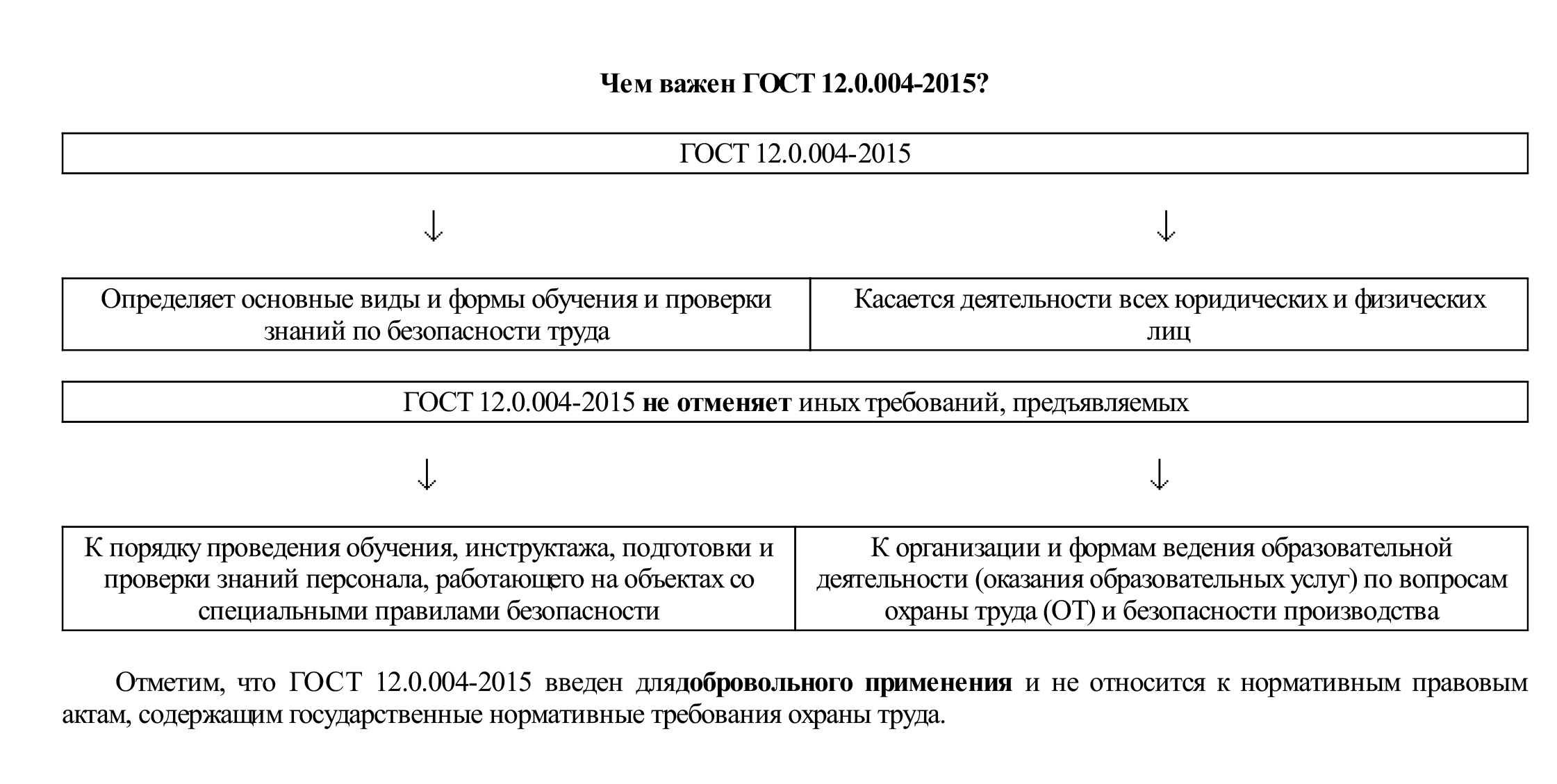 Чтобы ответить на этот вопрос, воспользуйтесь Обзором, подготовленым нашими экспертами. В нем конкретизированы моменты организации обучения безопасности труда (далее — ОБТ) в ГОСТ 12.0.004-2015 «ССБТ. Организация обучения безопасности труда. Общие положения». ГОСТ вступит в силу 1 марта 2017 года. За основу стандарта взяты основные положения ГОСТ 12.0.004-90 и Постановления Министерства труда и социального развития РФ и Минобразования России от 13.01.2003 № 1/29.