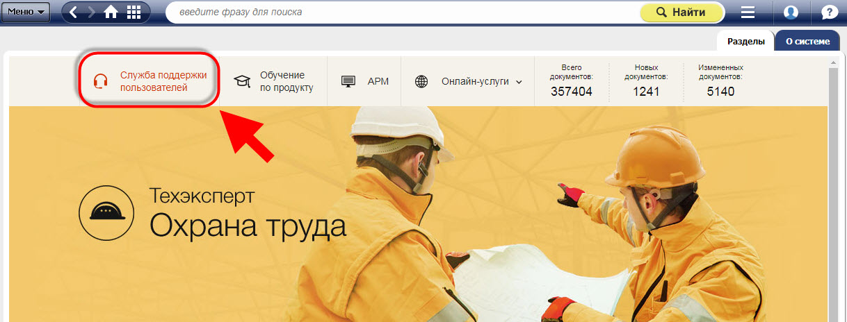 В системе «Техэксперт: Охрана труда» обратиться в СПП можно с помощью кнопки в левом верхнем углу: