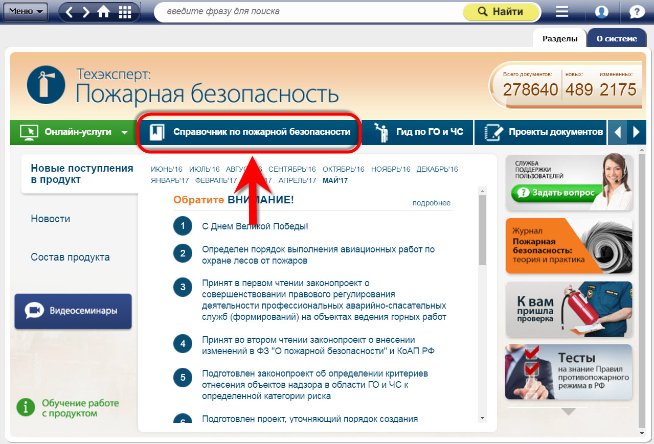 Найти его можно в «Справочнике по пожарной безопасности» на главной странице системы.