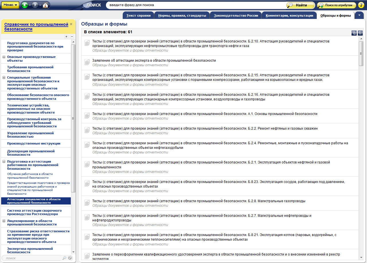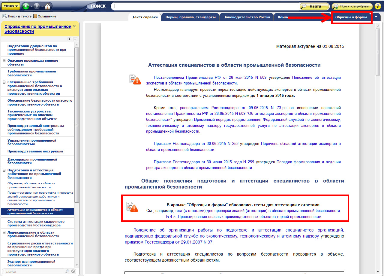 В системе «Техэксперт: Промышленная безопасность» представлены тесты с ответами для проверки знаний (аттестации) в области промышленной безопасности. Ответы на тесты подготовлены экспертами. Раздел регулярно пополняется.