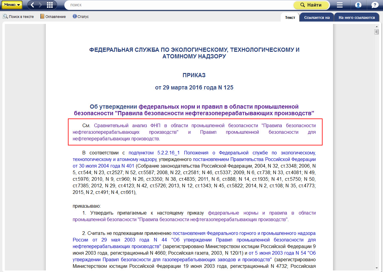 ФНП в области промышленной безопасности «Правила безопасности нефтегазоперерабатывающих производств», утвержденные Приказом Ростехнадзора N125 от 29.03.2016 пришли на смену «Правил промышленной безопасности для нефтеперерабатывающих производств», утвержденных постановлением Федерального горного и промышленного надзора России N44 от 29.05.2003.