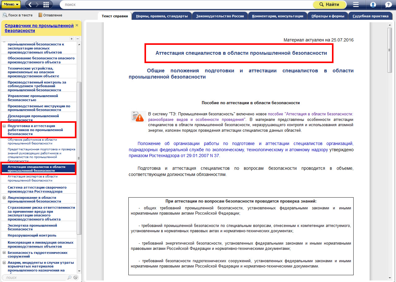 В профессиональной справочной системе «Техэксперт: Промышленная безопасность» вы найдете все, что нужно для проведения аттестации специалистов в области промышленной безопасности: