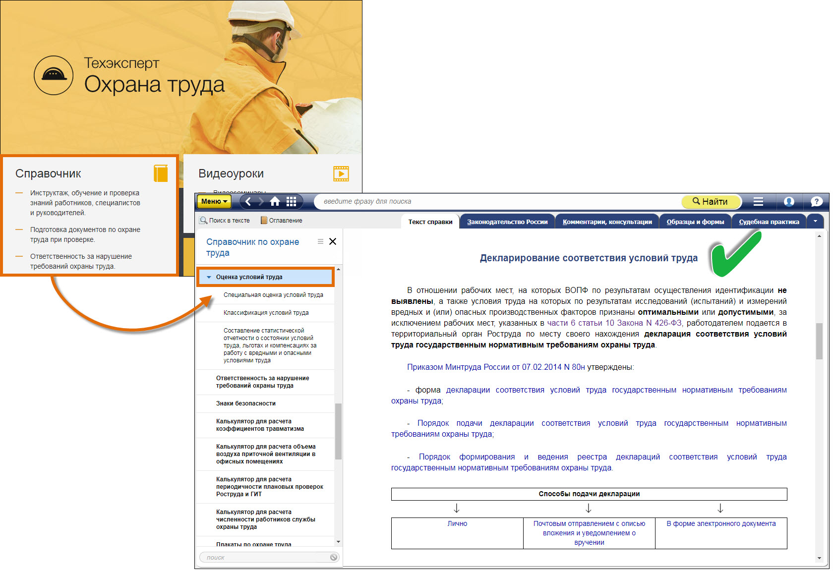В «Справочнике» в системе «Техэксперт: Охрана труда» вам доступны справочные материалы раздела «Оценка условий труда». В нем представлена вся необходимая информация по теме, а также ссылки на актуальные НПА, комментарии экспертов, образцы и формы документов.