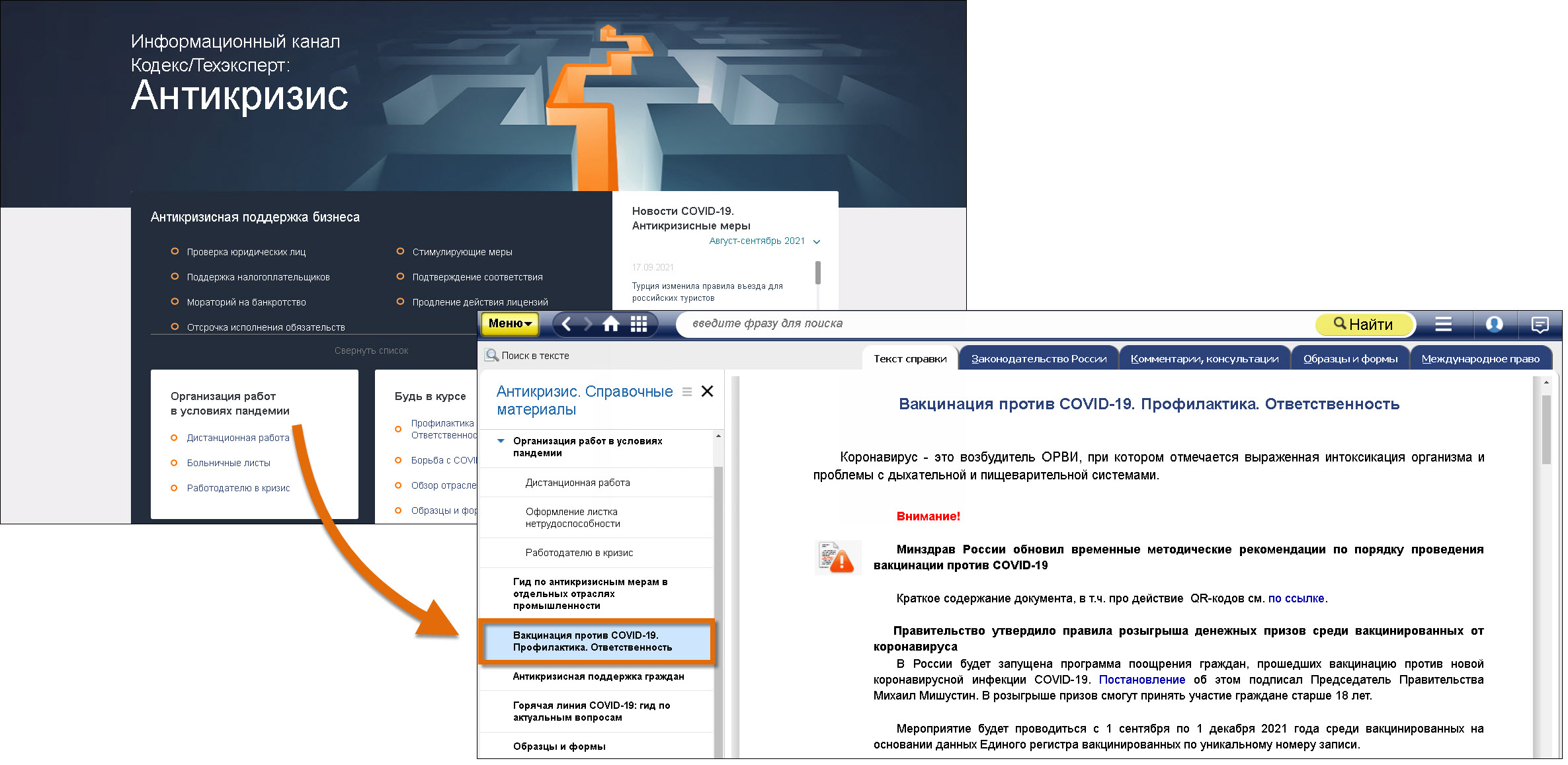 В составе бесплатной профессиональной справочной системы «Информационный канал Кодекс/Техэксперт: Антикризис» вам доступен справочный раздел «Организация работ в условиях пандемии», в котором подробно рассмотрены вопросы вакцинации против COVID-19.