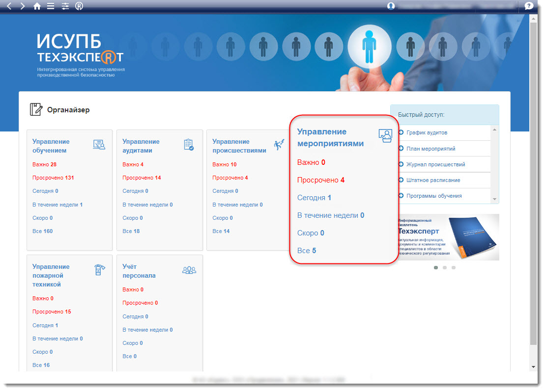 Решение ИСУПБ «Техэксперт» выведет на экран всю информацию по выбранному мероприятию и предоставит возможность добавить комментарий, файл, а также покажет историю изменений. А система напоминаний и уведомлений своевременно оповестит ответственных лиц о необходимости выполнения работ по мероприятиям.