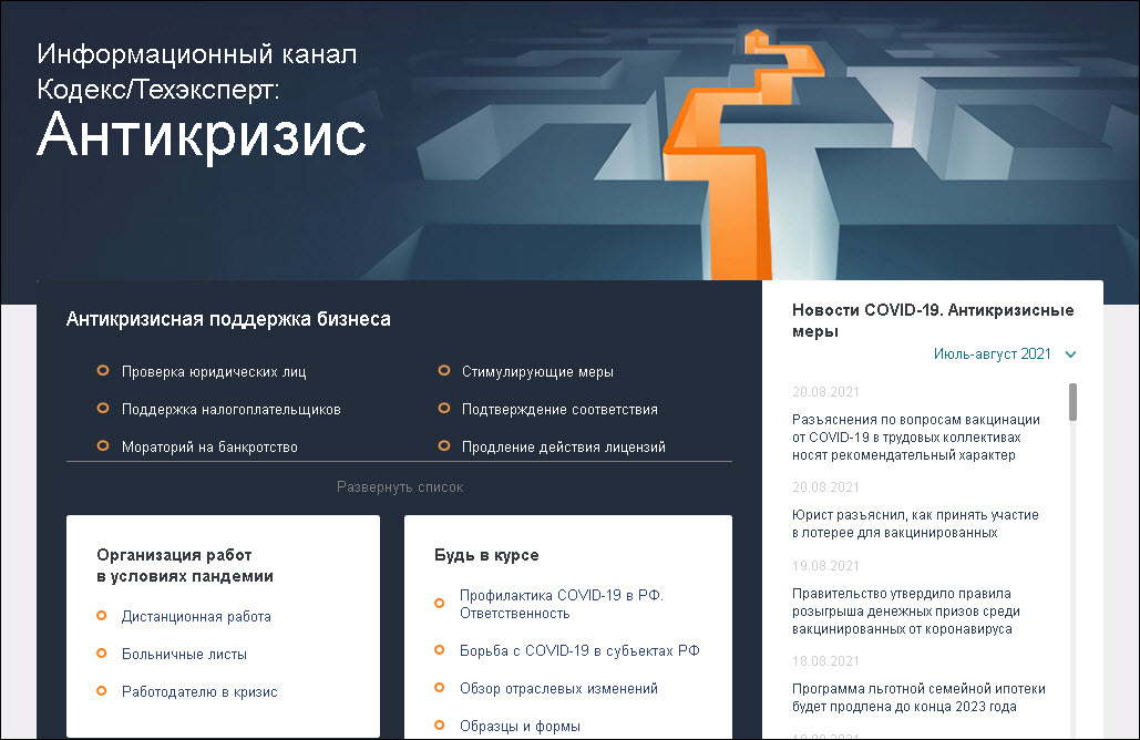 «Информационный канал Кодекс/Техэксперт: Антикризис» — бесплатная профессиональная справочная система, разработанная с целью поддержки коммерческих организаций, государственных органов и граждан в условиях кризиса, возникшего на фоне распространения коронавирусной инфекции.