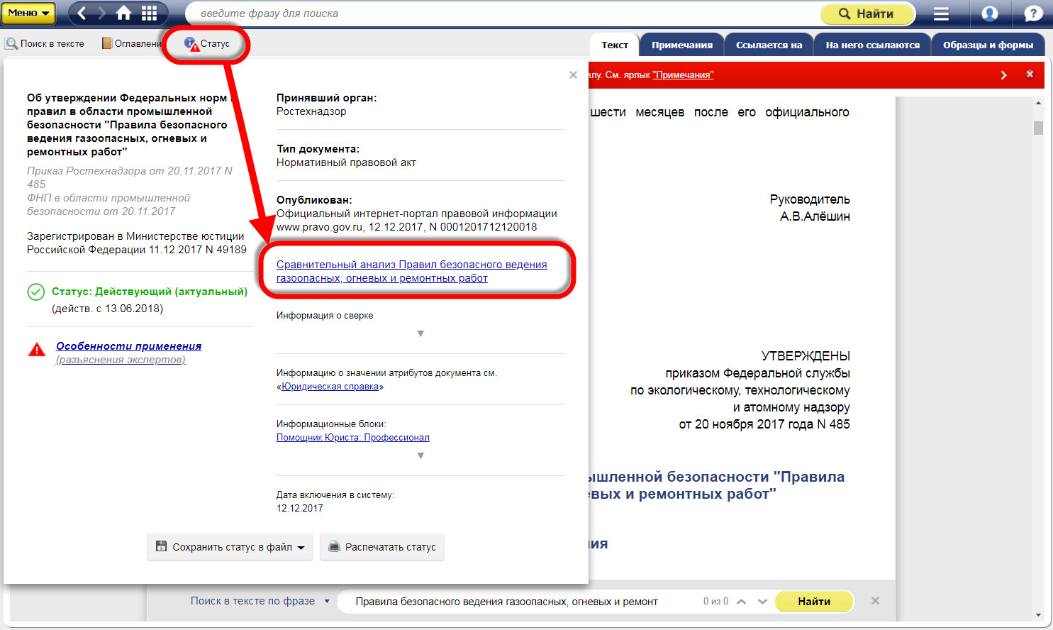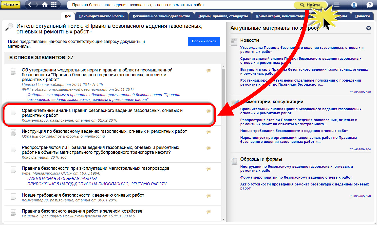 Найти сравнительный анализ можно с помощью интеллектуального поиска в системах «Техэксперт: Промышленная безопасность» и «Техэксперт: Пожарная безопасность»: