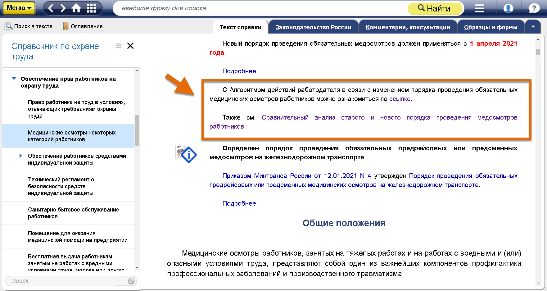 В систему «Техэксперт: Охрана труда» включен пошаговый алгоритм, в котором подробно рассмотрены действия и мероприятия, которые необходимо провести, чтобы соответствовать новым требованиям! Также в системе уже доступно экспертное аналитическое сравнение старого и нового порядка проведения медосмотров. Все материалы можно найти в справке «Медицинские осмотры некоторых категорий работников».