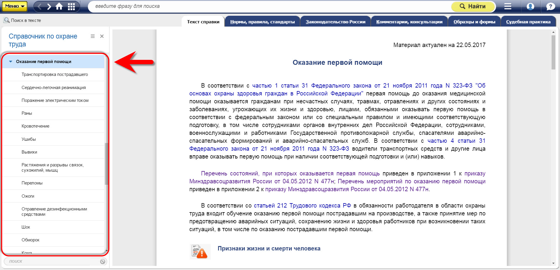 1. Справочный материал «Оказание первой помощи», в котором специалисту доступна вся необходимая информация, подкрепленная ссылками на нормативную базу. Найти его можно в «Справочнике по охране труда» на главной странице системы.