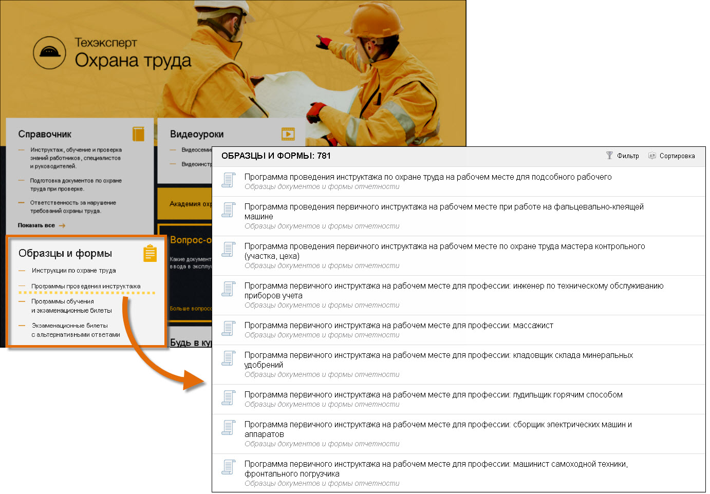В системе «Техэксперт: Охрана труда» вам доступно более 780 программ для различных профессий и видов работ. Перейти к ним можно по ссылке в блоке «Образцы и формы» на главной странице системы.