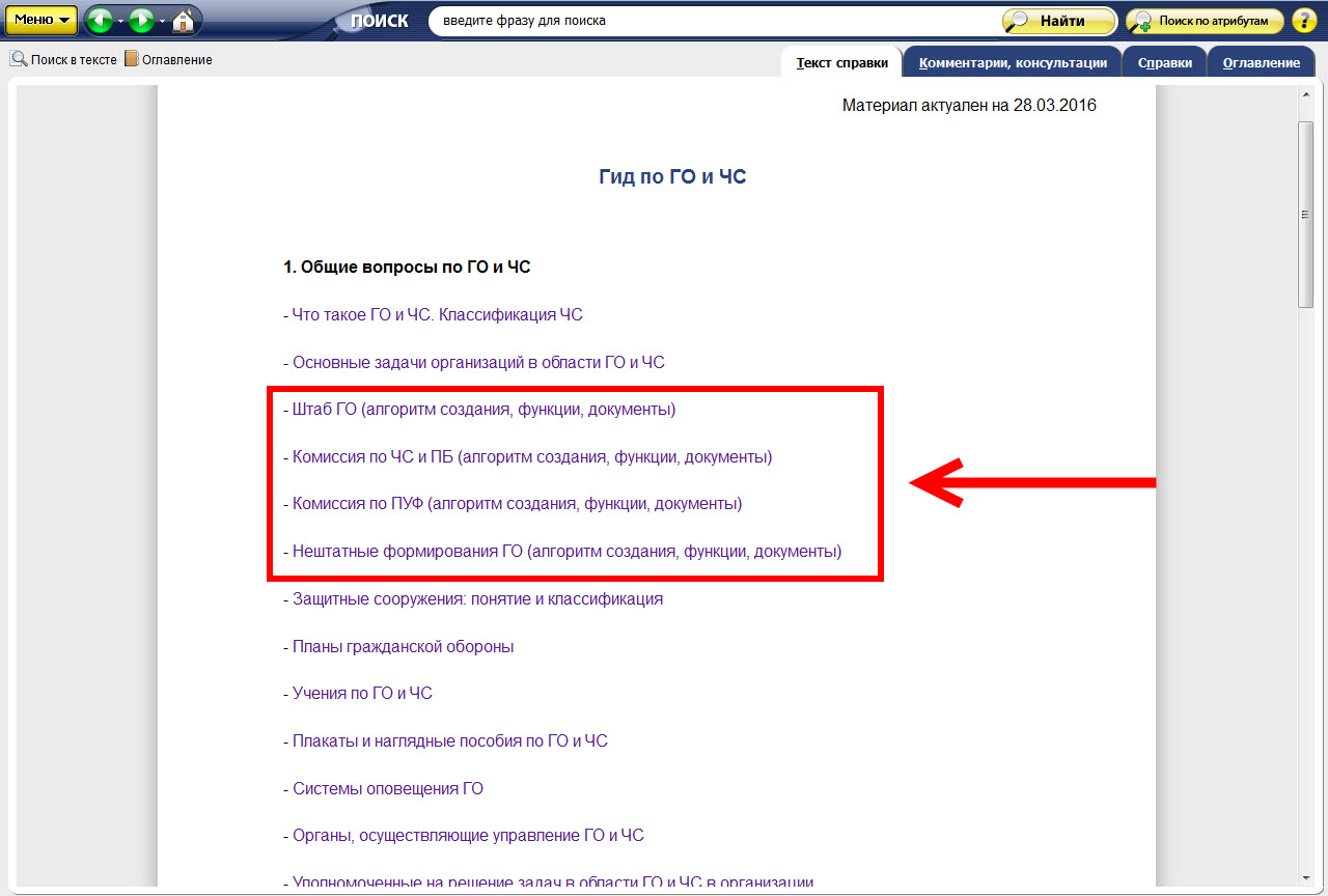 В Гиде по ГО и ЧС в системе «Техэксперт» вы также найдете всю необходимую информацию о создании и функционировании штаба ГО, комиссии ПУФ, и нештатных формирований ГО.