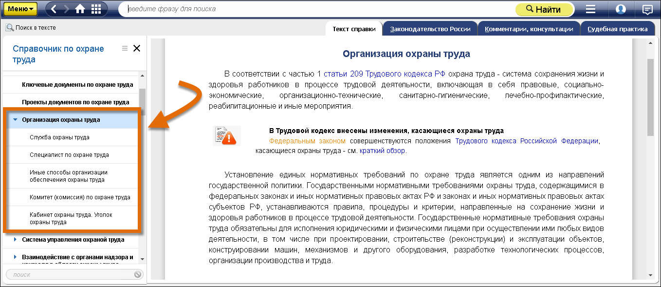 Всю необходимую информацию об организации охраны труда на предприятии, а также обо всех изменениях в этой сфере ищите в справочном материале «Организация охраны труда» в системе «Техэксперт: Охрана труда»