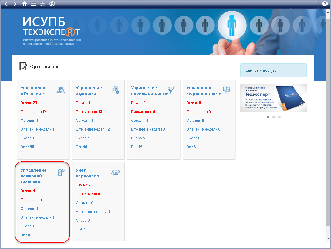 Что может предложить специалистам «Техэксперт»? Комплект «ИСУПБ „Техэксперт“. Пожарная безопасность» в рамках интегрированной системы управления производственной безопасностью. Это комплект модулей для автоматизации процессов обучения, планирования и учета результатов внутренних и внешних проверок выполнения требований нормативных актов в области пожарной безопасности, а также контроля мероприятий и сроков проведения регламентных работ.