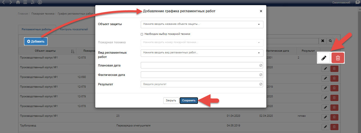 Работа с «ИСУПБ „Техэксперт“. Пожарная безопасность» интуитивно понятна и не представит сложности даже для тех специалистов, которые «не дружат» с новыми технологиями. Внесение информации реализуется через кнопку «Добавить», корректировка сведений осуществляется с помощью кнопок действий «Изменить» либо «Удалить». После сохранения данных решение ИСУПБ учитывает потребность и автоматически оповещает о задачах в зависимости от сроков их выполнения в органайзере.
